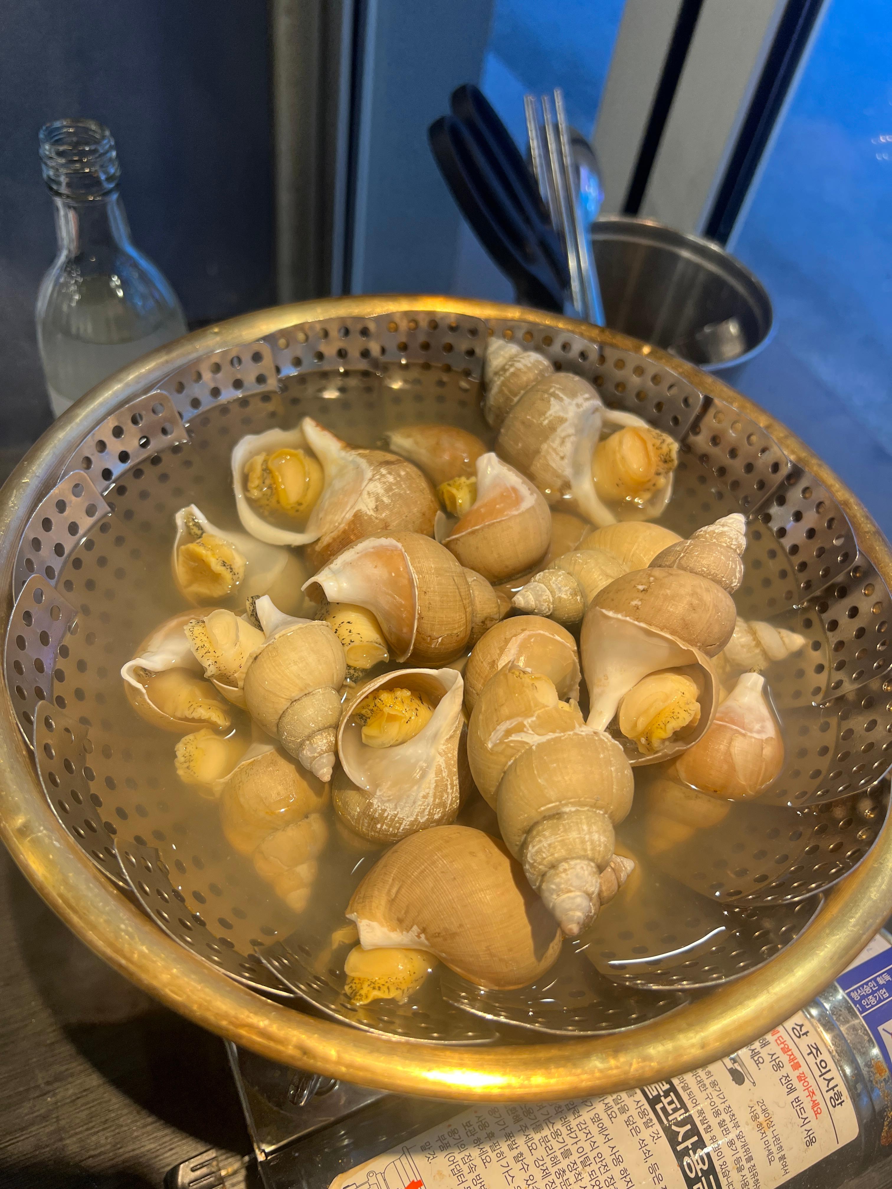 통골뱅이는 이렇게 큰 대야에 담겨서 나오는데요 김이 모락모락 나는 게 정말 먹음직스럽죠?